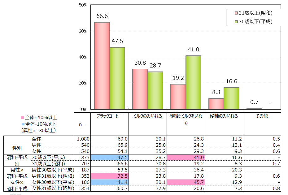 加えて、平成世代の「砂糖とミルク」を入れる派が「ミルクのみいれる」・「砂糖のみいれる」派よりも突出した数値を出していることからも、近年の甘党なコーヒー好きの台頭を感じます。