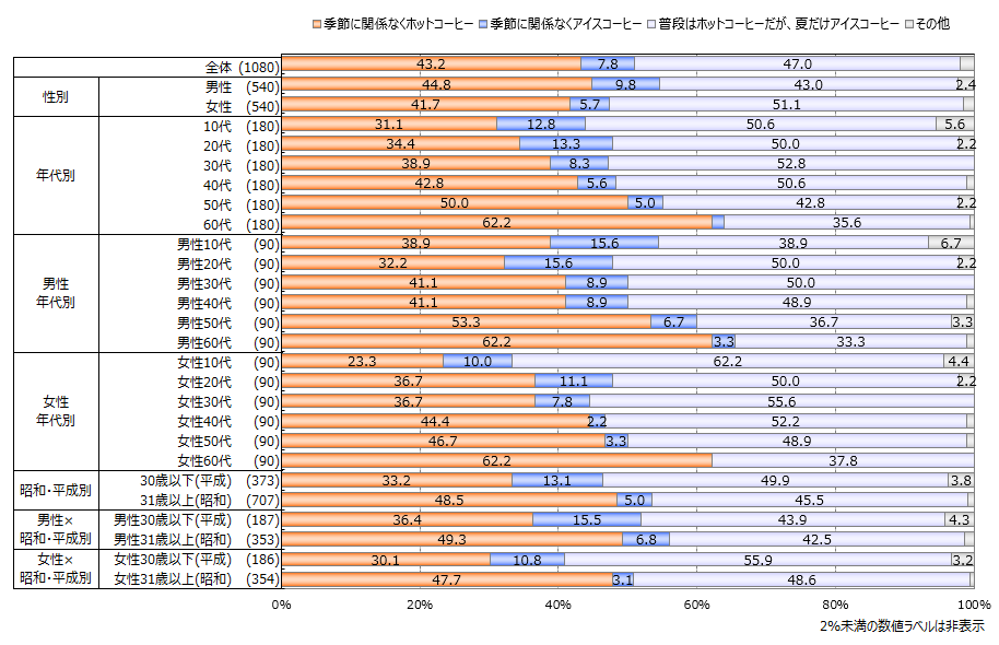昭和世代は平成世代より「季節に関係なくホット」で飲む割合が高く、平成世代は「季節に関係なくアイス」で飲む割合が昭和世代に比べて2倍以上も高いことが分かりました。