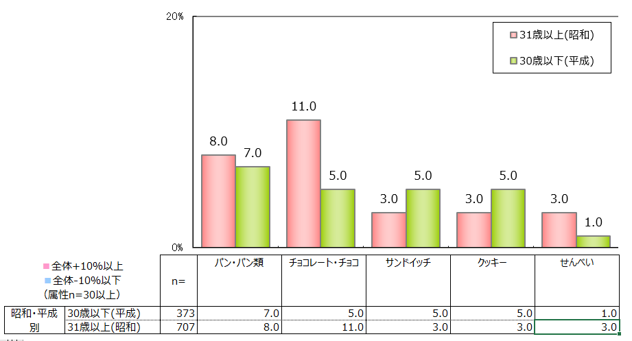 そんな中気になったのは、食べ物オール部門。平成世代の結果において、昭和世代の回答では2番手だった「パン類」が1位に選ばれていたり、「サンドイッチ」が昭和時代から根強い支持の「チョコ」と並ぶ2位に浮上していたりと、お菓子やつまみというより食事に近い品目が、上位にランクインしていました。