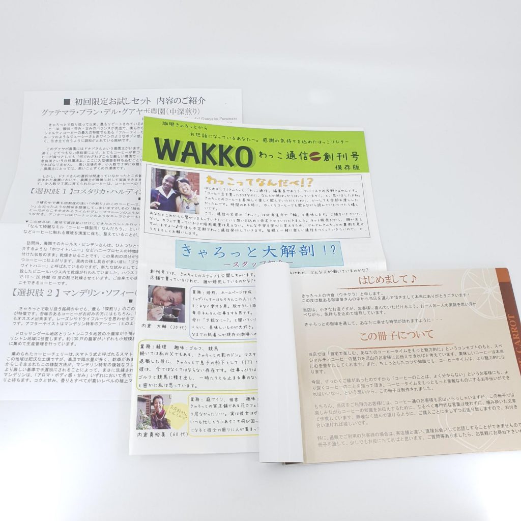 200gの豆が二つ。珈琲きゃろっとの情報紙。中挽きのサンプル。その他コーヒーの情報紙が入ってました。