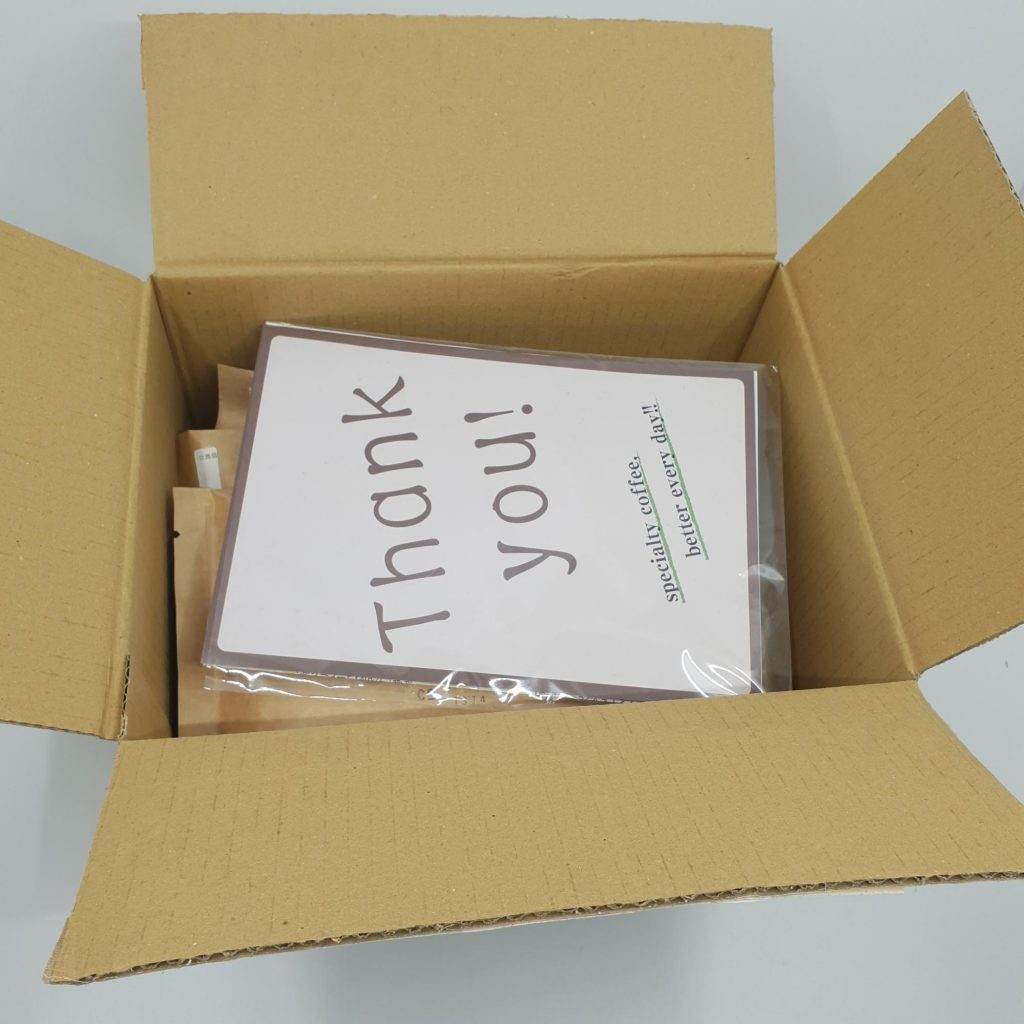 ダンボールをオープン。各種の情報紙と100g豆が4種類入っていました。