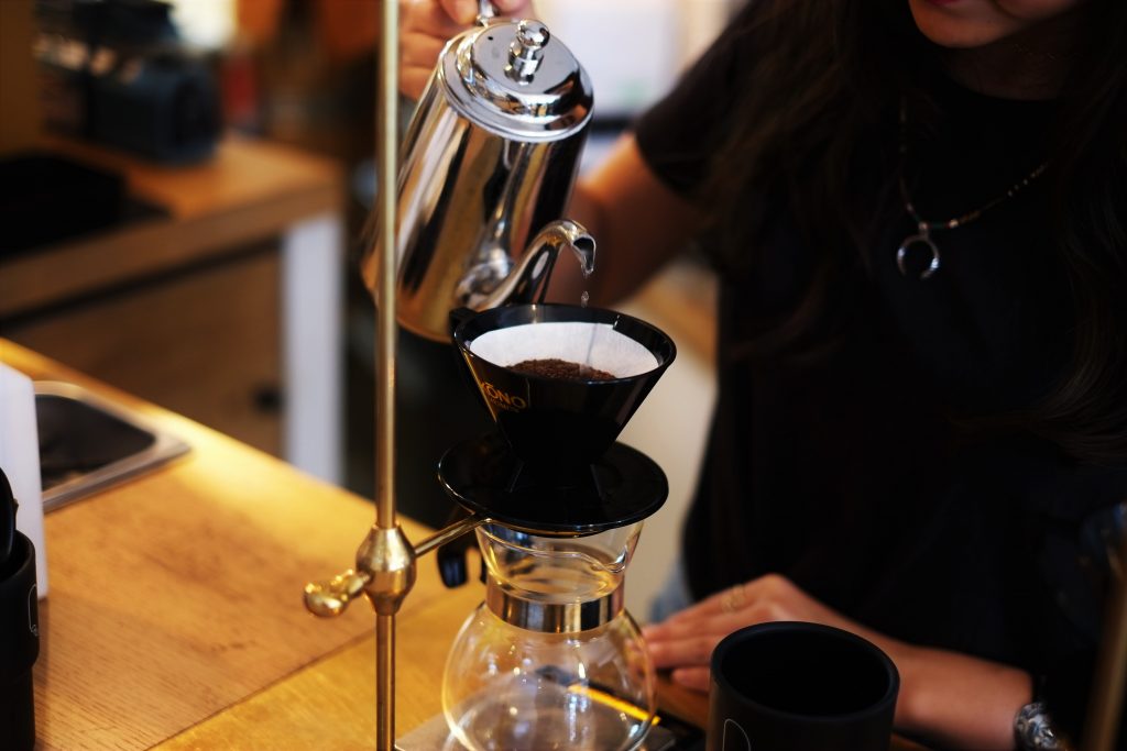 お湯で豆を蒸らすのにも、1滴1滴お湯を粉の上に垂らし、じっくりと手間を掛けてコーヒーが抽出されます。