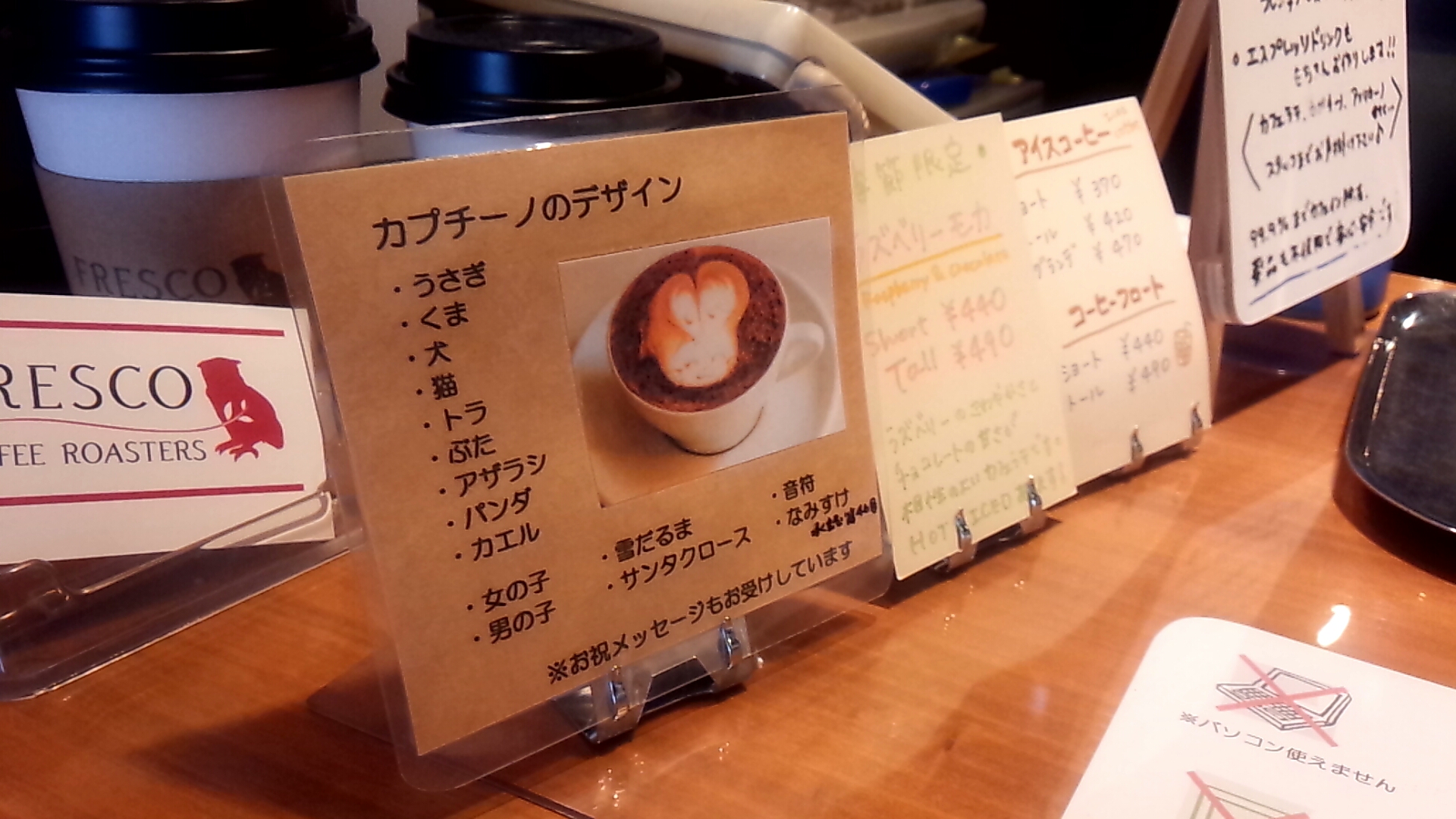 様々なラテアートのメニューには、杉並区のキャラクター「なみすけ」の文字も