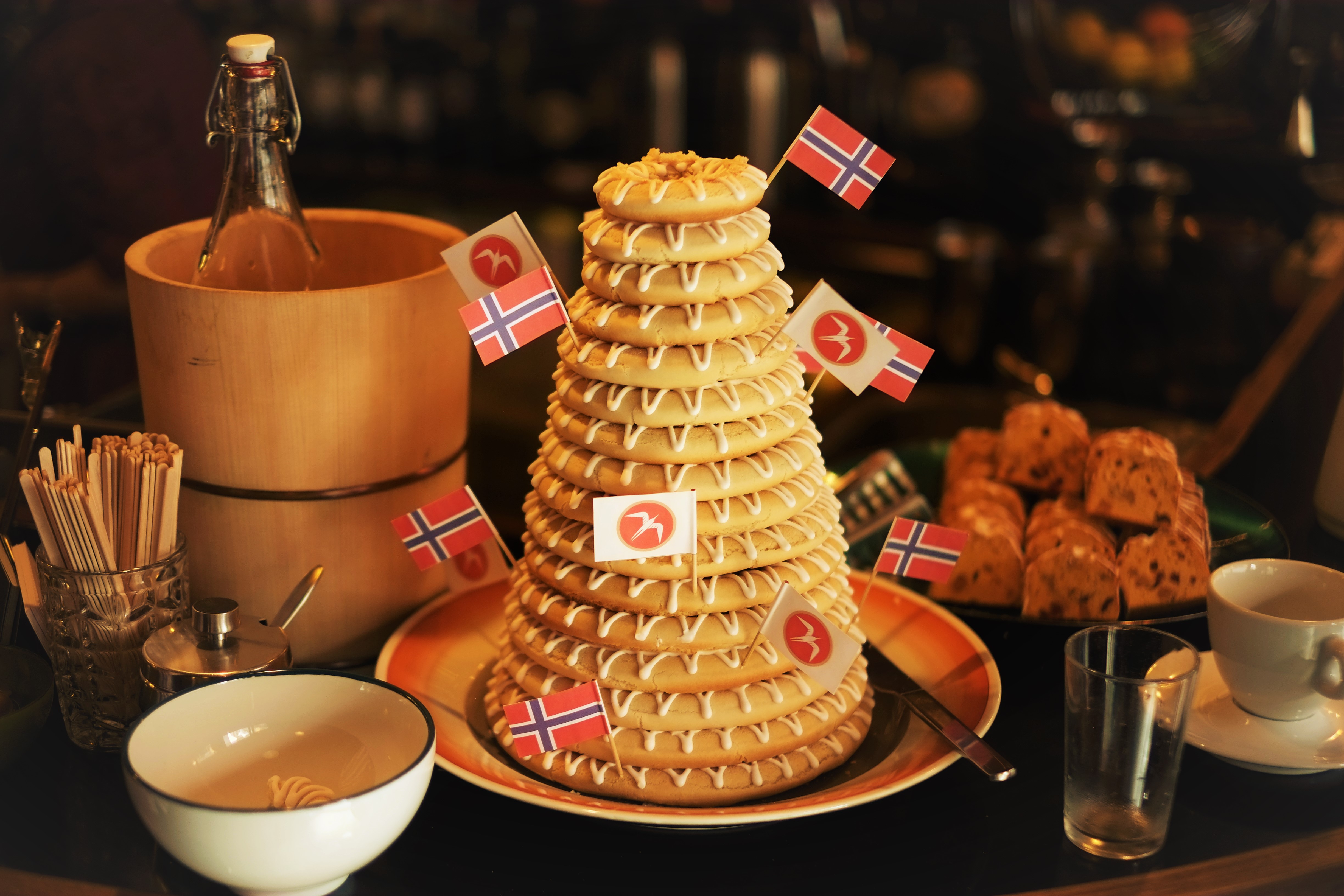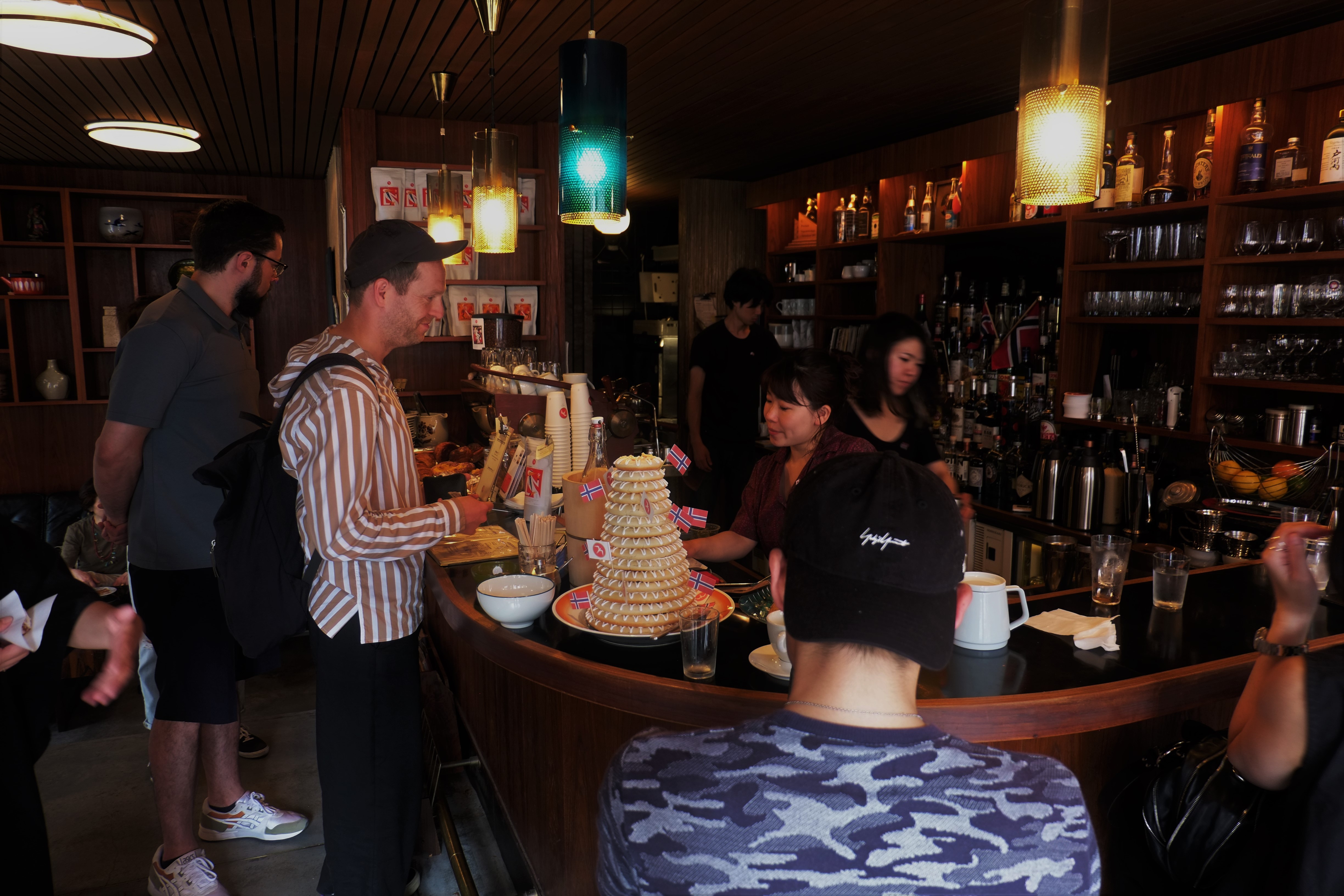 今日はノルウェーの建国日とのことで、ノルウェーのお祝いには欠かせないリング状の焼き菓子を重ねたクランセカーケや、中にはクルミやベリーがたっぷり入ったパウンドケーキが無料でふるまわれていました。どちらも、コーヒー好きの国のお菓子とあって、シンプルな味が、果実味いっぱいのコーヒーにぴったり合います。